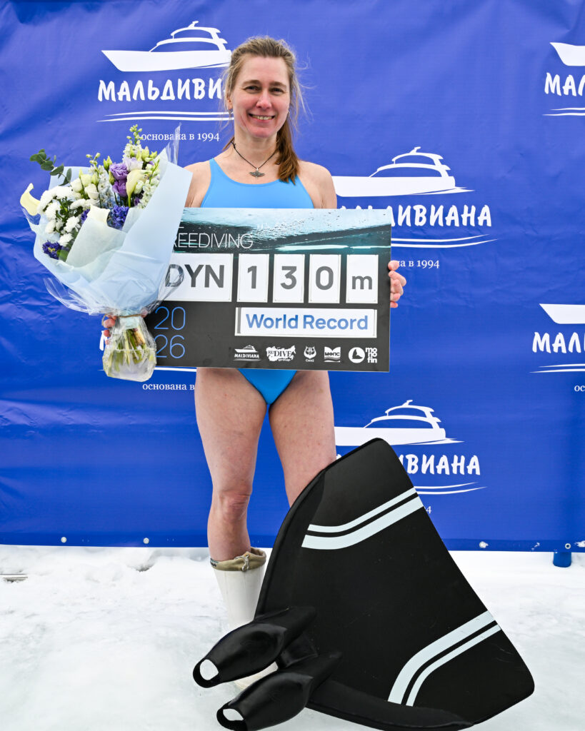 1 минута 45 секунд (105 секунд) — столько времени понадобилось спортсменке, чтобы пройти эту дистанцию на одном дыхании под сплошным ледяным покровом.